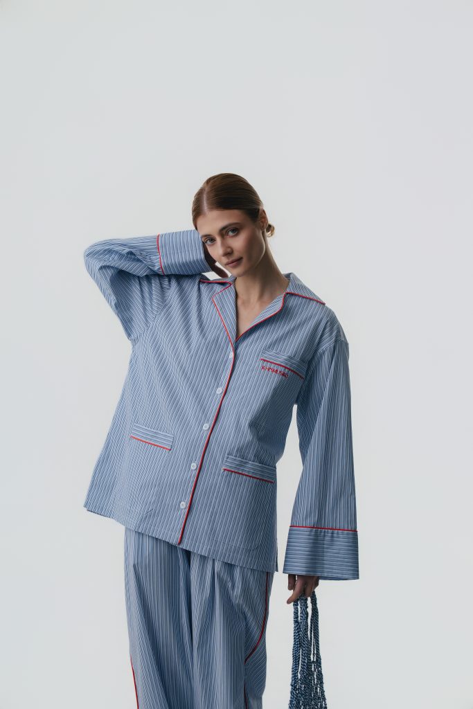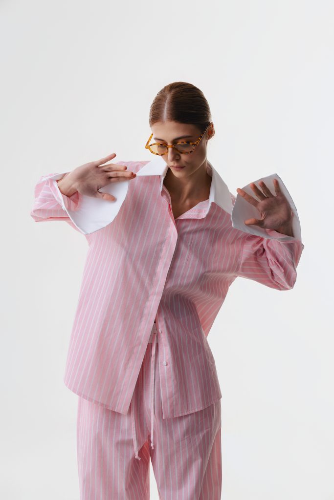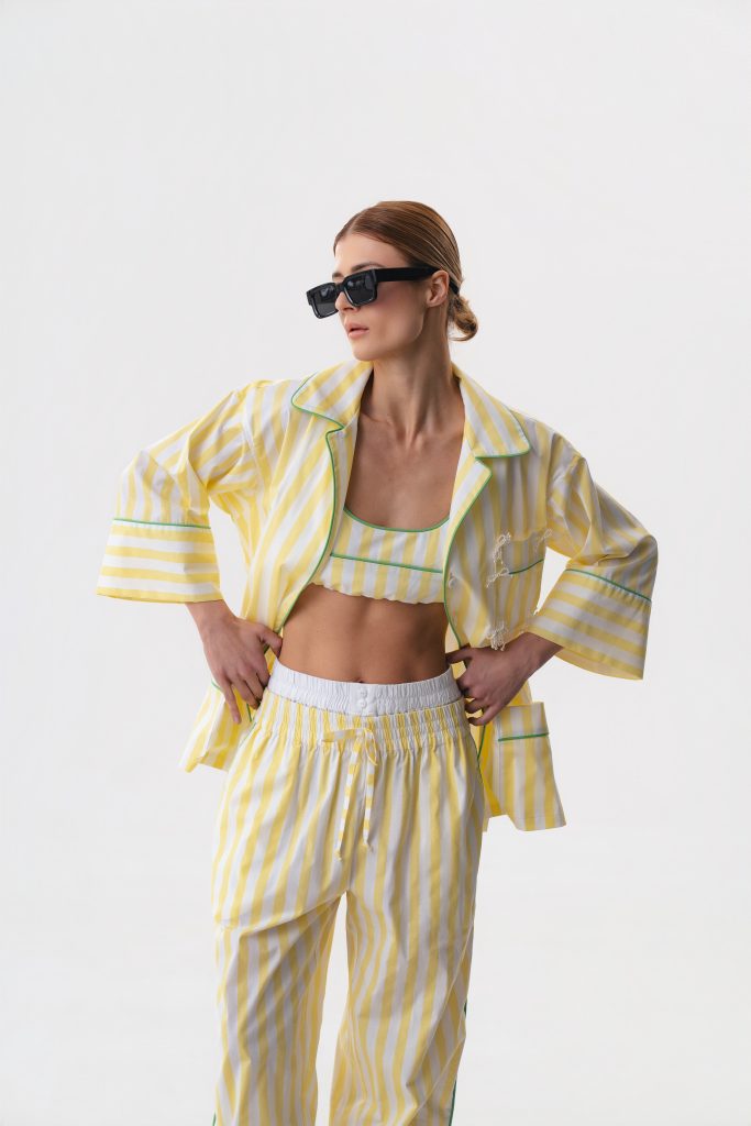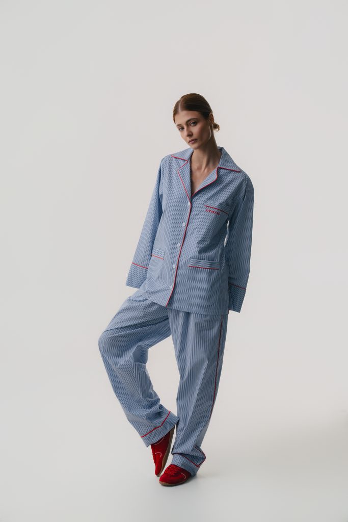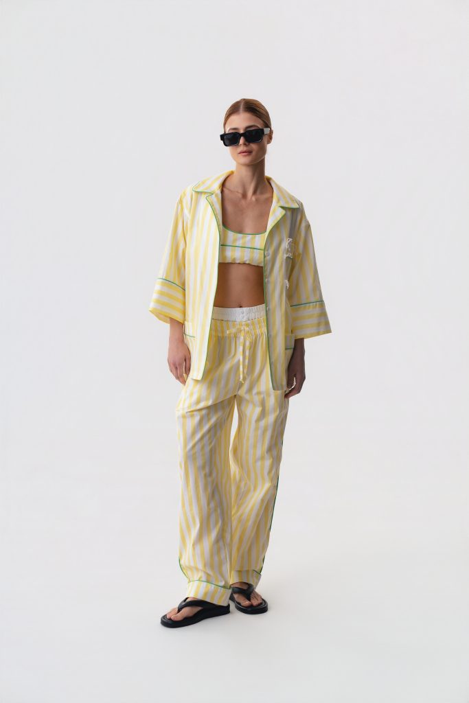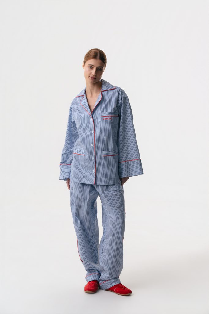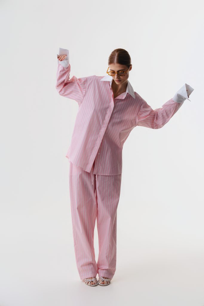 Основу дропу формують піжами у смужку та біла сукня – лаконічні, функціональні предмети гардероба, що поєднують домашній комфорт із міською універсальністю. Бренд свідомо розмиває межу між одягом для відпочинку та повсякденністю, пропонуючи речі, які органічно існують у різних сценаріях життя: від ранкової рутини до ділових зустрічей, від онлайн-нарад до швидких поїздок і справ.