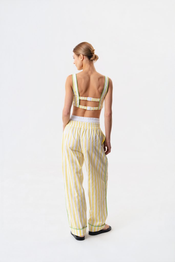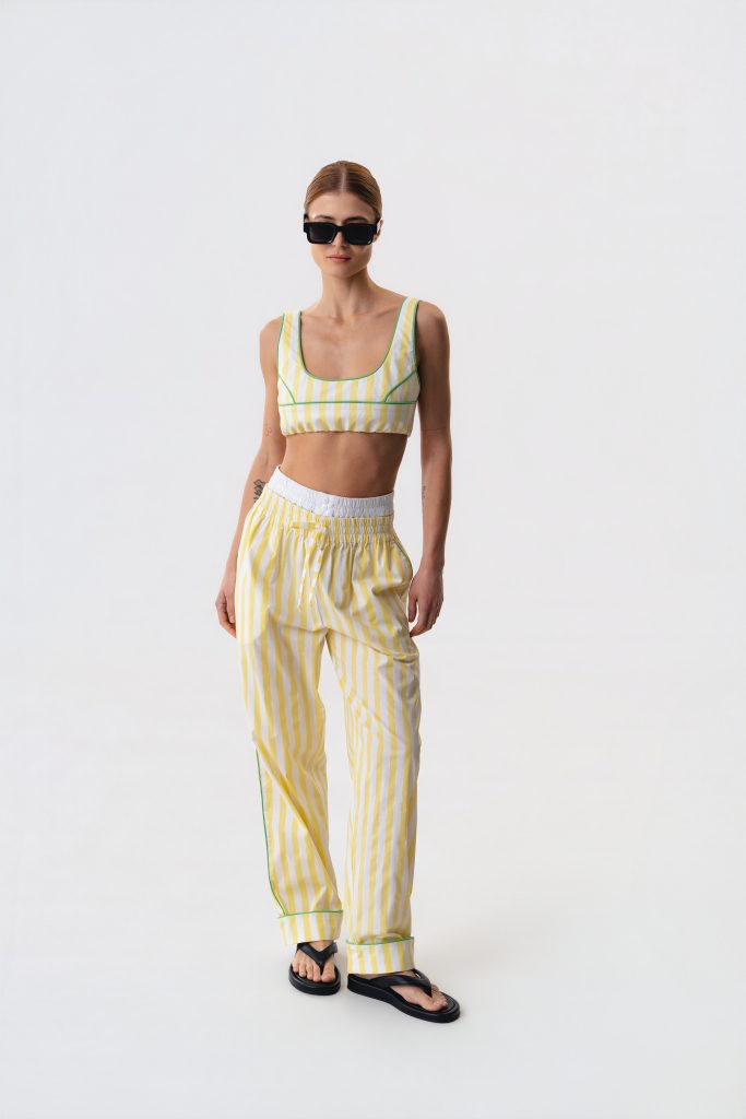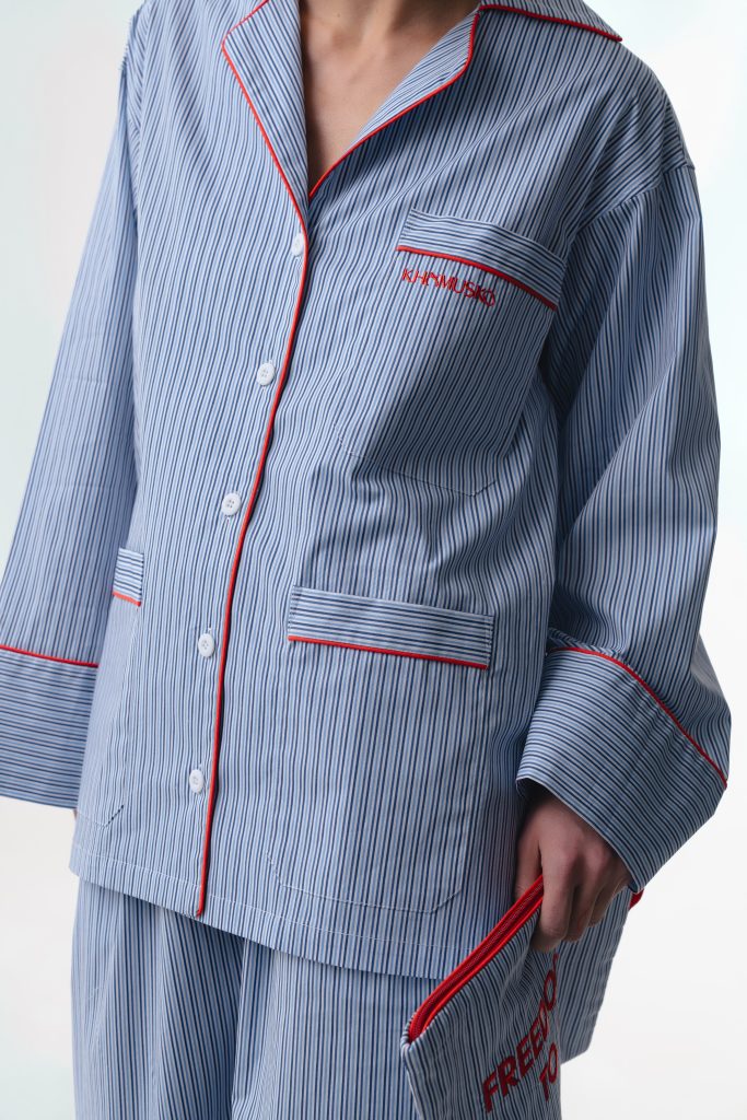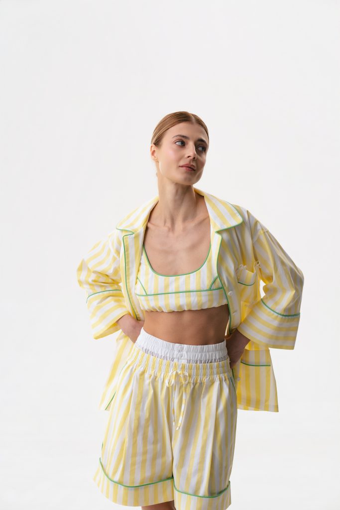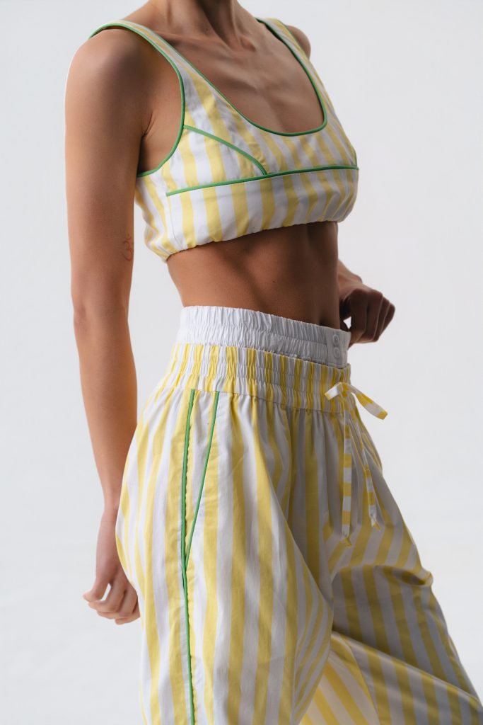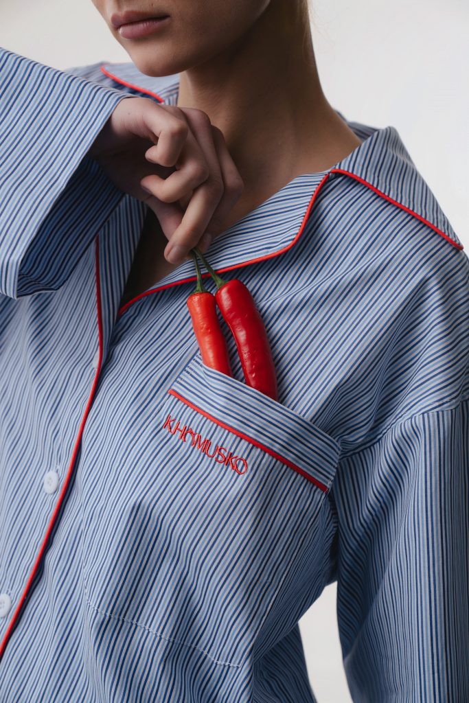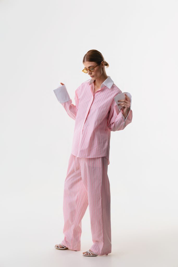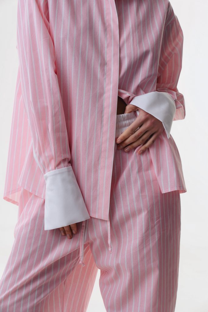 Основу дропу формують піжами у смужку та біла сукня – лаконічні, функціональні предмети гардероба, що поєднують домашній комфорт із міською універсальністю. Бренд свідомо розмиває межу між одягом для відпочинку та повсякденністю, пропонуючи речі, які органічно існують у різних сценаріях життя: від ранкової рутини до ділових зустрічей, від онлайн-нарад до швидких поїздок і справ.