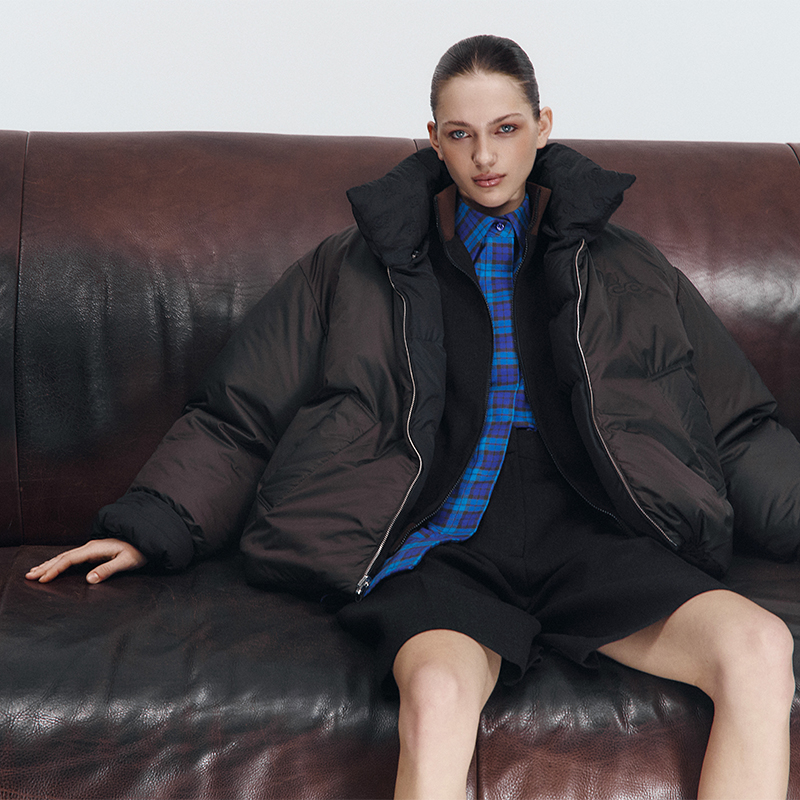 У центрі дропу – базові силуети: двосторонні пуховики з принтами, пальто, костюми та сорочки у відтінках шоколадного, темно-синього та глибокого чорного.