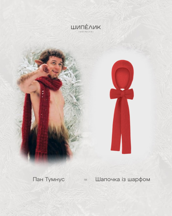 Ми пошили хутряні штани – схожі на ті, що були в містера Тумнуса. Наша контентменеджерка принесла табі, щоб зробити ніжки казковішими. Зробили червоний шарф і шапку – як натяк на відомий візуальний символ. Далі вже розганяли одяг довкола цієї візуальної ідеї: деякі речі були готові раніше, як той самий шарф, і просто ідеально інтегрувались у нову концепцію.